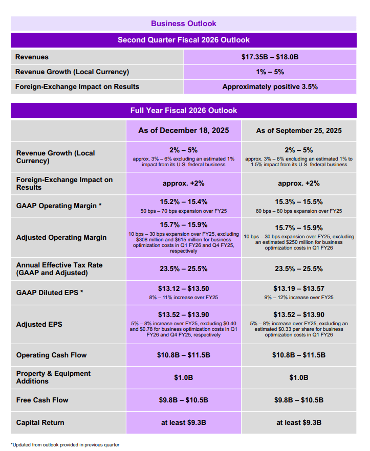 Outlook: Company continues to expect full-year revenue growth to be 2% to 5% in local currency (vs. estimated growth of 5.60% Y/Y). Excluding an estimated 1% impact from its U.S. federal business, company continues to expect revenue growth to be 3% to 6% in local currency • Now expects GAAP operating margin to be 15.2% to 15.4%, an expansion of 50 to 70 basis points; continues to expect adjusted operating margin to be 15.7% to 15.9%, an expansion of 10 to 30 bps • Now expects GAAP diluted earnings per share to be in the range of $13.12 to $13.50, an 8% to 11% increase; continues to expect adjusted EPS to be in the range of $13.52 to $13.90 (vs. consensus of $13.77), a 5% to 8% increase.
