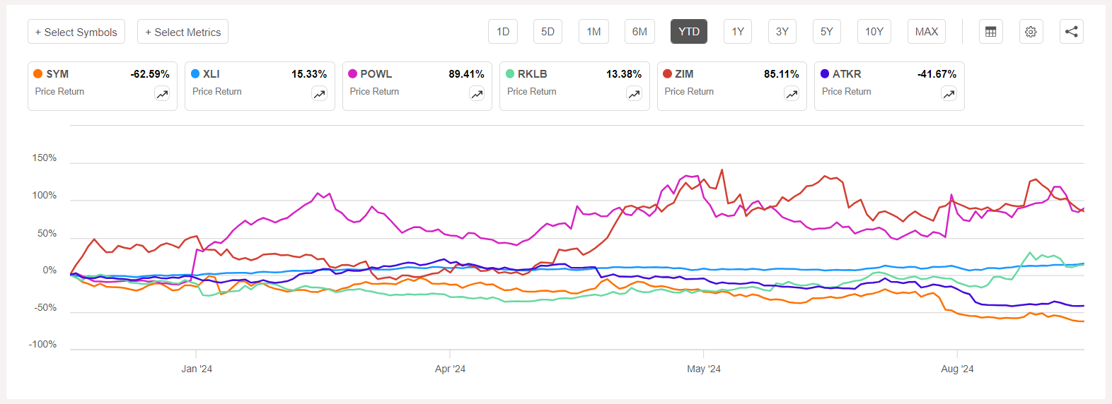 Powell Industries (POWL) -13.14%. Shares of the Houston-based company, which makes power-distribution equipment for electrical utilities, saw the impact from the decline in Super Micro Computer’s stock on Wednesday. POWL, which was the top industrial gainer last week, fell -10.02% on Wednesday. YTD, +89.41%.