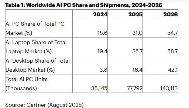 Gartner analysts forecast AI PC shipments will total 143 million units and are projected to represent 55% of the total PC market in 2026. The firm added that these AI PCs will become the norm by 2029.