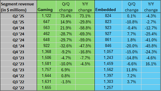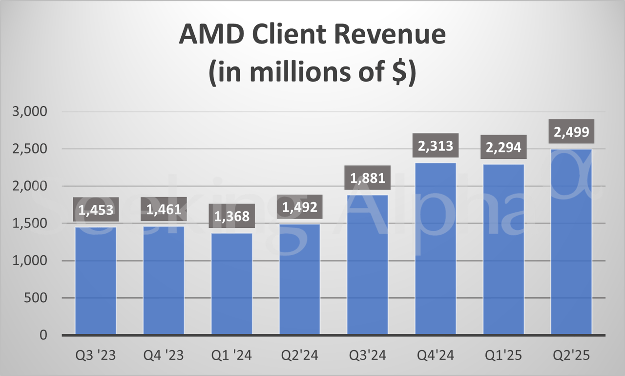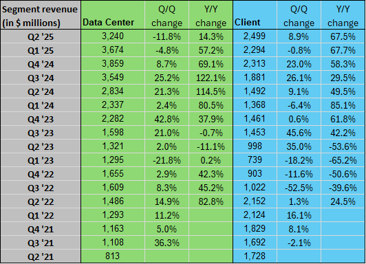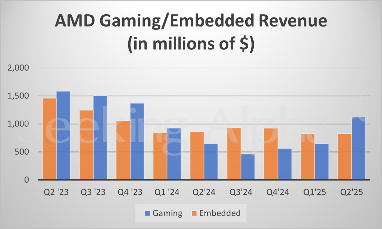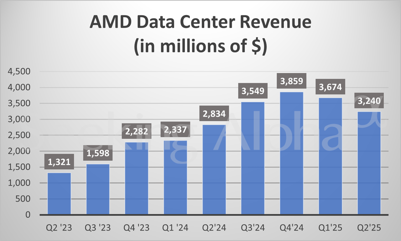 AMD in charts: Data Center revenue rises 14% Y/Y Posted on August 5, 2025 by wpadmin More on AMD AMD: I Am Loading Up Before Q2 Earnings Inside AMD’s Most Pivotal Quarter This Is Why It’s Time To Trim Your AMD Stock Ahead Of Q2 Earnings (Downgrade) AMD Non-GAAP EPS of $0.48 in-line, revenue of $7.69B beats by $260M AMD Q2 earnings on deck: What to expect