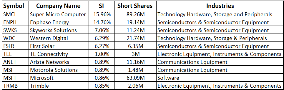Super Micro (SMCI) continued to be the most shorted stock in the information technology sector in November, with a short interest of 15.96%, followed by Enphase Energy (ENPH) at 14.76%, and Skyworks Solutions (SWKS) at 7.06%.