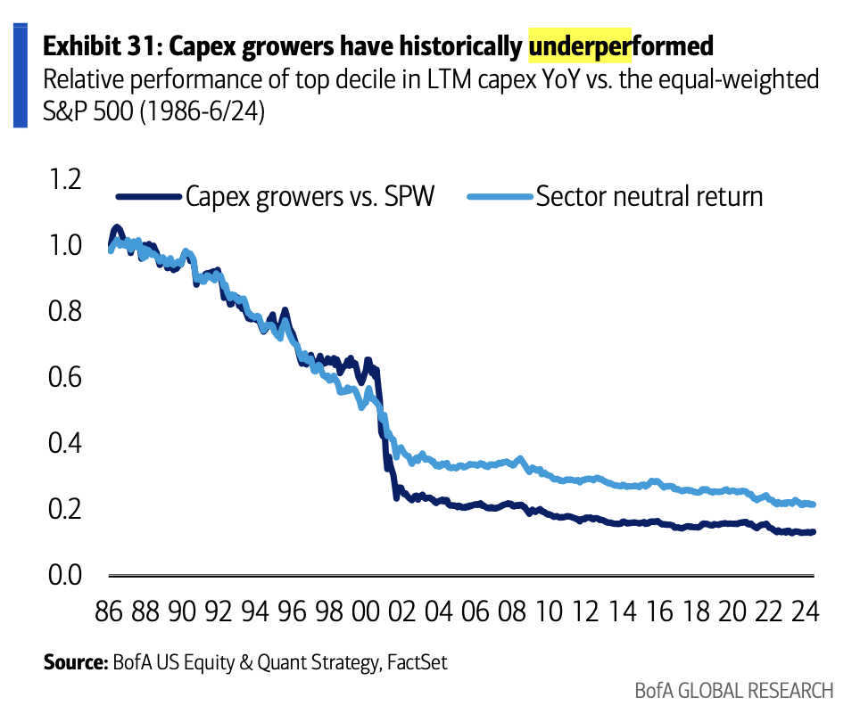Hyperscalers Alphabet (GOOG)(GOOGL), Microsoft (MSFT), Meta Platforms (META) and Amazon (AMZN) are expected to account for most of the S&P 500’s (SP500)(SPY) capex growth in 2024, at $198B. Subramanian said historically, companies that are in reinvestment cycles underperform, sharing this chart: