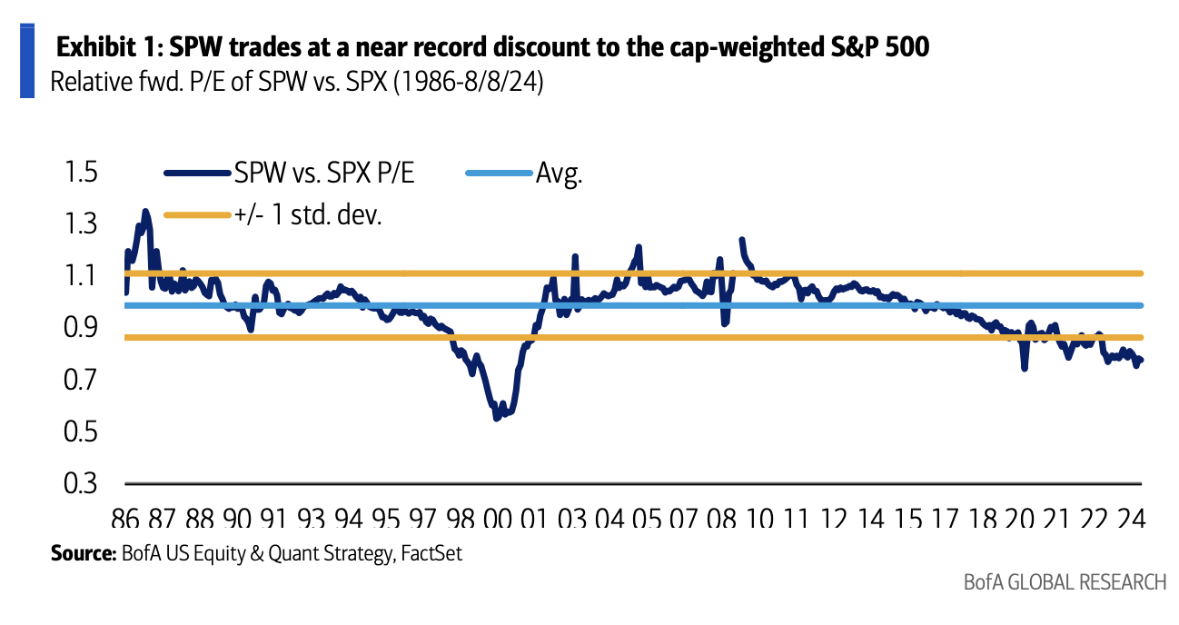 Meanwhile, even with mega-caps pacing the market’s recent pull-back, the equal-weighted S&P 500 (SP500) is trading at an “extreme discount” to the S&P 500, approaching “Tech Bubble” levels, Subramanian said, and published this chart: