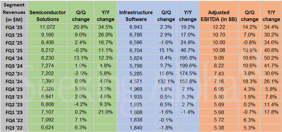 Broadcom in charts: Revenue from both segments continue to register double-digit Y/Y growth Posted on December 11, 2025 by wpadmin Seeking Alpha Seeking Alpha Seeking Alpha Seeking Alpha