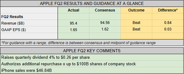 Earnings Snapshot: AAPL edges by expectations for earnings, revenue Posted on May 1, 2025 by wpadmin More on Apple Why Apple’s Valuation Makes Sense Apple Earnings Preview: Beware The China Tariffs Apple: Don’t Buy The Dip Apple slips as China, Services weakness weigh; unveils $100B buyback, boost dividend Apple raises dividend by 4% to $0.26, announces $100B buyback