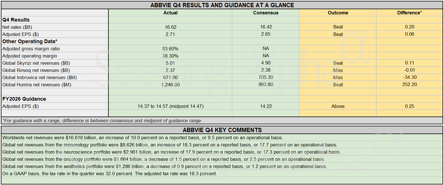 Earnings Snapshot: AbbVie tops Q4 estimates; initiates FY26 outlook above forecast Posted on February 4, 2026 by wpadmin *Other Operating Data Consensus Source: Bloomberg