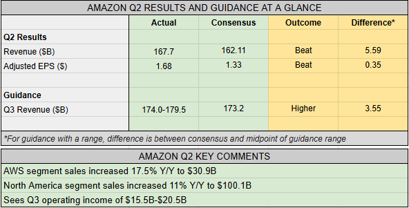 Earnings Snapshot: Amazon tops expectations in Q2 Posted on July 31, 2025 by wpadmin More on Amazon Prime Time Tech Stocks: Amazon And Celestica Tech Titans’ AI Strategy Amazon Q2 Preview: Massive White Collar Automation Amazon posts a powerhouse quarter again; shares dip as guidance is weighed Amazon GAAP EPS of $1.68 beats by $0.35, revenue of $167.7B beats by $5.59B