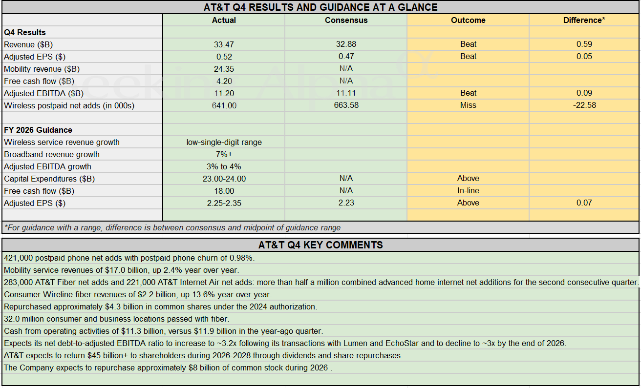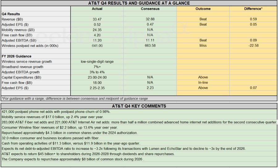 Earnings Snapshot: AT&T tops Q4 estimates, guides FY2026 profit above consensus Posted on January 28, 2026 by wpadmin