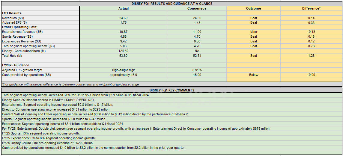 Earnings Snapshot: Disney tops Q4 estimates; reaffirms FY25 outlook Posted on February 5, 2025 by wpadmin *Other Operating Data Consensus Source: Bloomberg More on Disney: Disney GAAP EPS of $1.40 beats by $0.09, revenue of $24.7B beats by $150M Disney Still Has Upside Potential Ahead Of Earnings Why Disney Could Rebound Disney’s profit in focus during Q1 earnings The Walt Disney Company stock snaps six straight days of gains