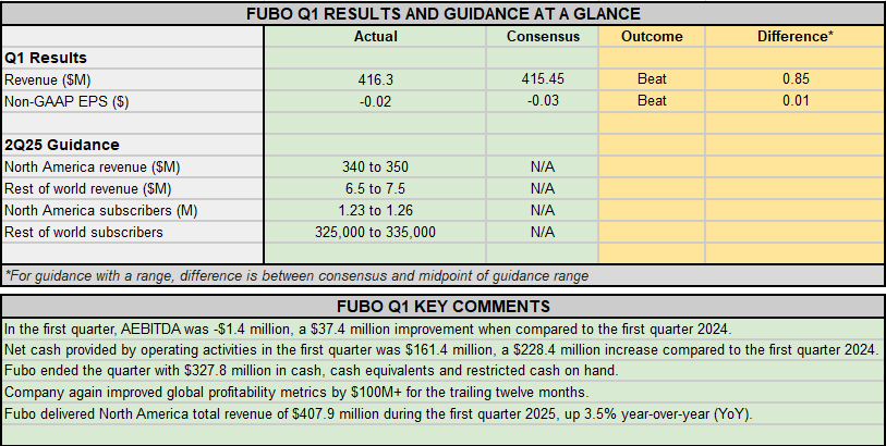 Earnings Snapshot: FuboTV tops Q1 estimates, sees 10% YoY growth in Q2 North America rev Posted on May 2, 2025 by wpadmin More on FuboTV fuboTV Overcame The Odds Why fuboTV Remains A Hold: Analyzing Market Risks And Opportunities fuboTV: This ‘Hidden Gem’ Is Insanely Cheap And Buyable FuboTV reports mixed Q1 results; initiates Q2 outlook FuboTV Q1 2025 Earnings Preview