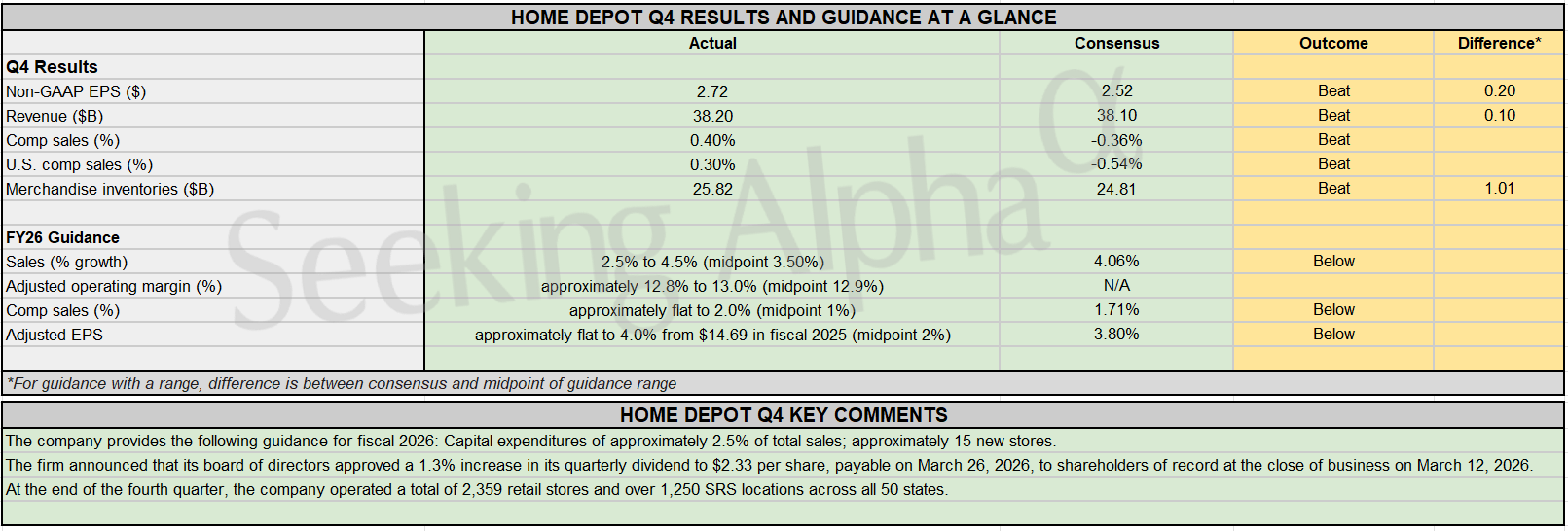 Earnings Snapshot: Home Depot beats Q4 estimates on strong comp sales, but cautious full-year guidance drags outlook Posted on February 24, 2026 by wpadmin *Other Operating Data Consensus Source: Bloomberg