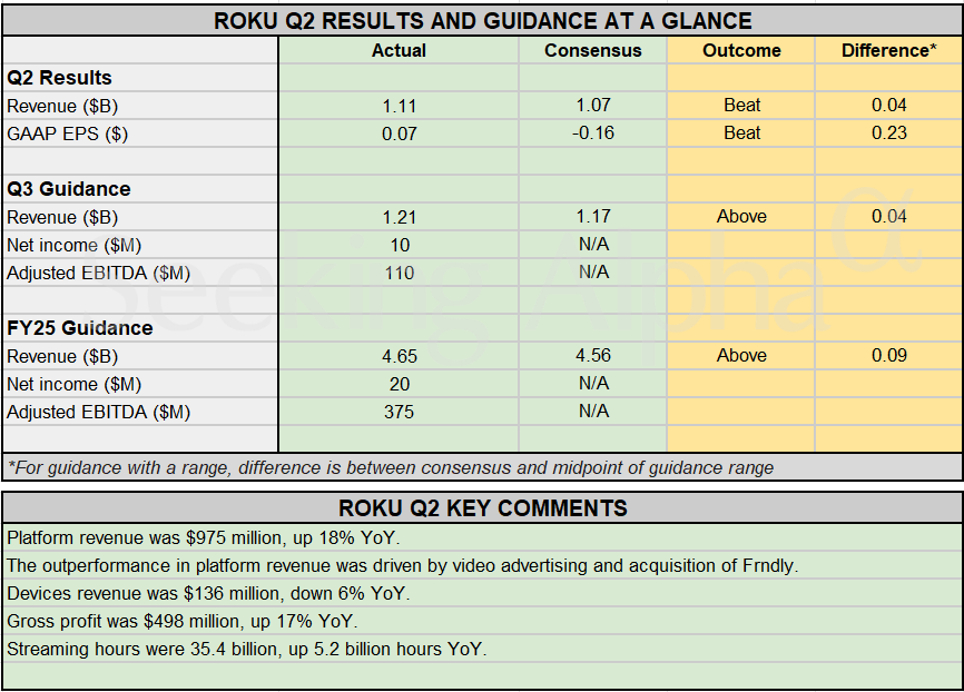 Earnings Snapshot: Roku guides Q3, FY25 revenue above forecast after earnings beat Posted on July 31, 2025 by wpadmin Seeking Alpha (Seeking Alpha) More on Roku Roku: Lingering Profitability Concerns Roku: Secular Growth Remains Promising, Thanks To Robust Streaming Demand Roku: Amazon Deal Is A Major Catalyst Roku GAAP EPS of $0.07 beats by $0.23, revenue of $1.11B beats by $40M Roku Q2 earnings ahead: Street sees upside potential from Amazon partnership