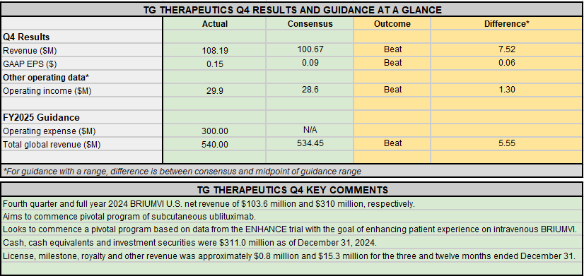 Earnings Snapshot: TG Therapeutics beats Q4 estimates, targets FY25 global revenue of ~$540M Posted on March 3, 2025 by wpadmin *Other Operating Data Consensus Source: Bloomberg