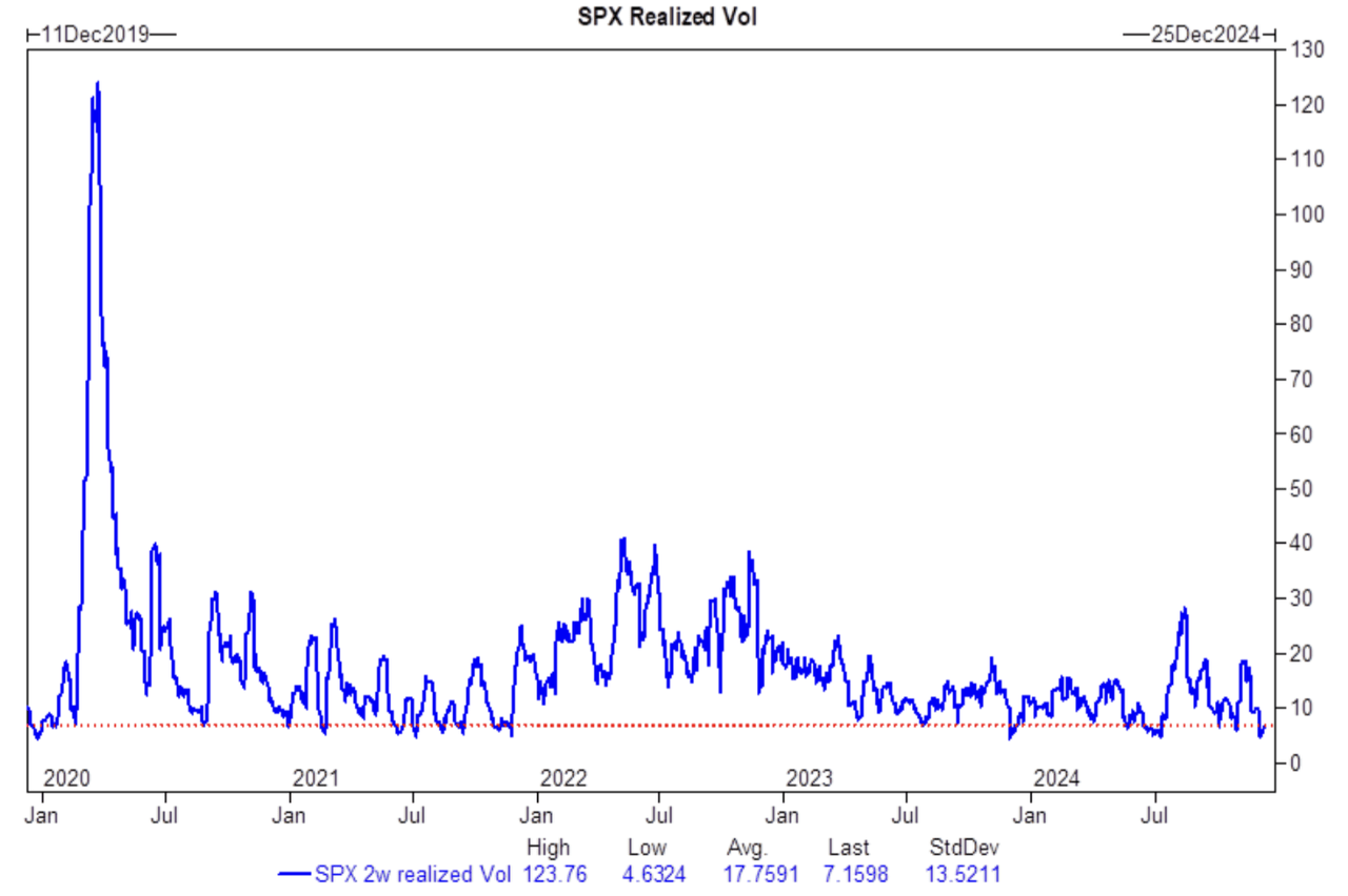 Rubner said two week S&P 500 realized vol is 8%. “I dropped in the red line on this chart – it pretty much doesn’t get lower than this,” he said of the chart below: