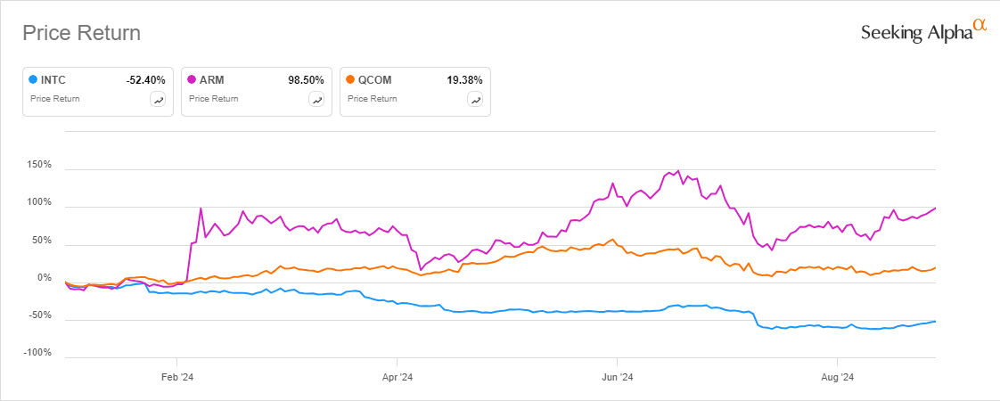 Take a look at the stock returns of Intel (INTC), Arm (ARM) and Qualcomm (QCOM) so far this year:
