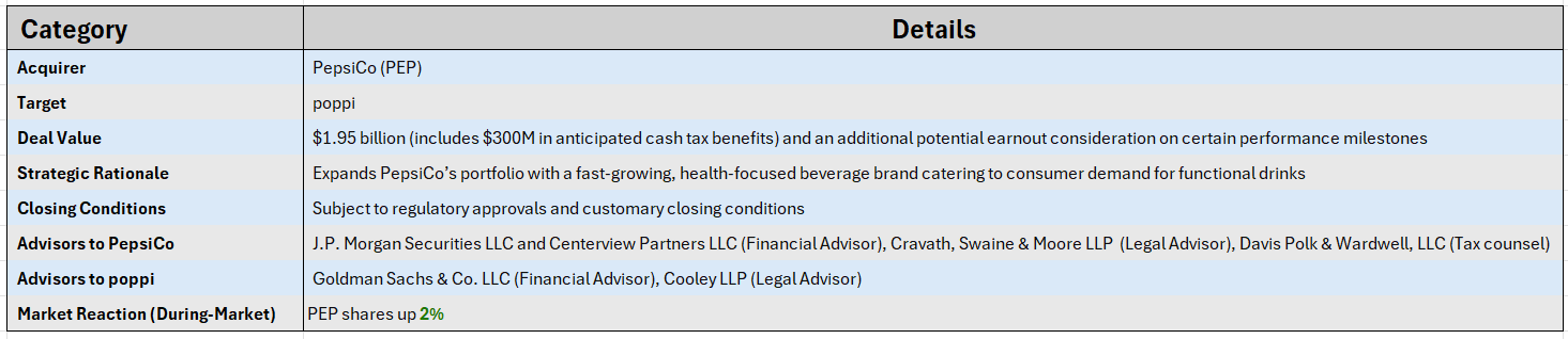 M&A Snapshot: PepsiCo to acquire prebiotic soda brand poppi in $1.95B deal Posted on March 17, 2025 by wpadmin