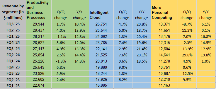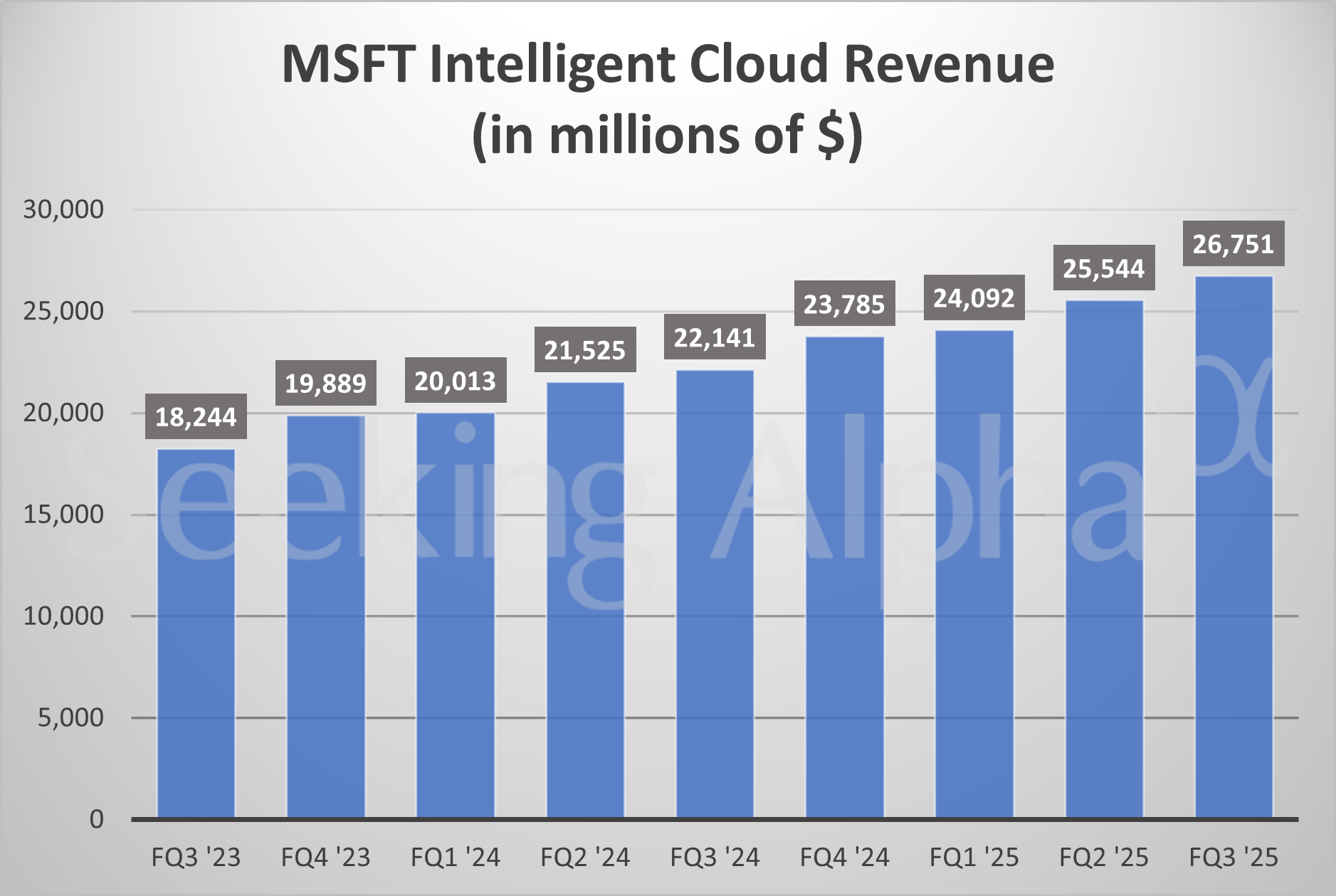 Microsoft in charts: Intelligent Cloud revenue climbs 21% Y/Y Posted on April 30, 2025 by wpadmin More on Microsoft Microsoft Q3 Preview: AI CapEx Moment Of Truth Microsoft: What To Consider Ahead Of The Q3 2025 Earnings Event Wall Street Brunch: Four More Mag 7 Plus Jobs And GDP Microsoft jumps as Q3 results show 33% Azure revenue surge Microsoft more earnings info