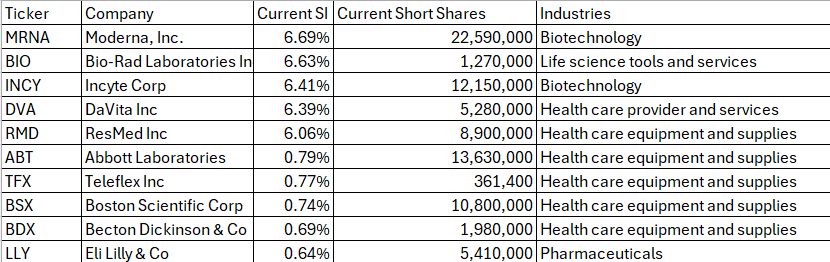 Eli Lilly (LLY), which has the highest weightage in the XLV index, was the least shorted company with a short interest of 0.64%, followed by Becton Dickinson (BDX) with a short interest of 0.69%.