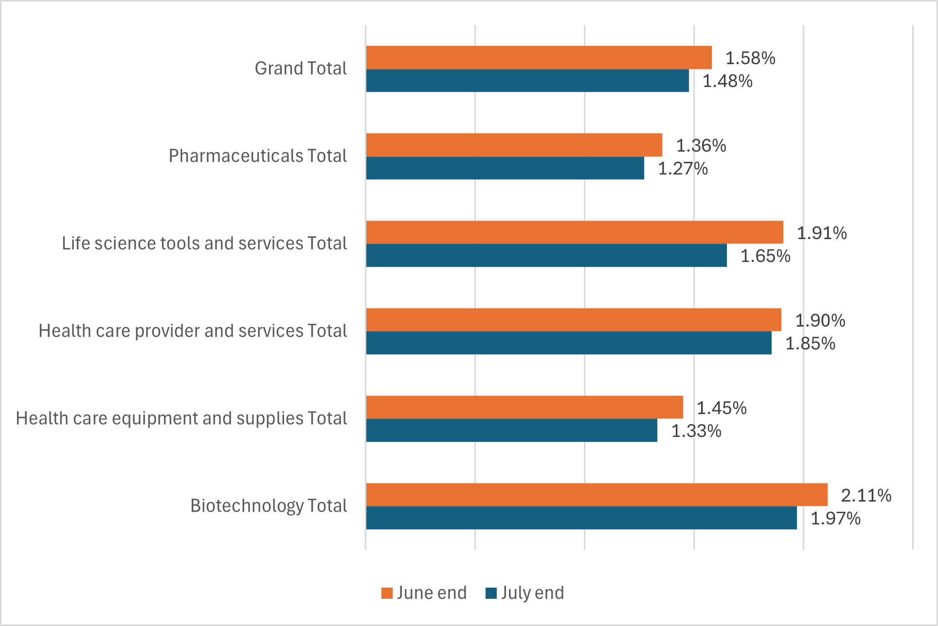 Short percentage in S&P 500’s healthcare companies fell at the end of July from June, with biotechnology industry emerging as the most shorted sector yet again this month.