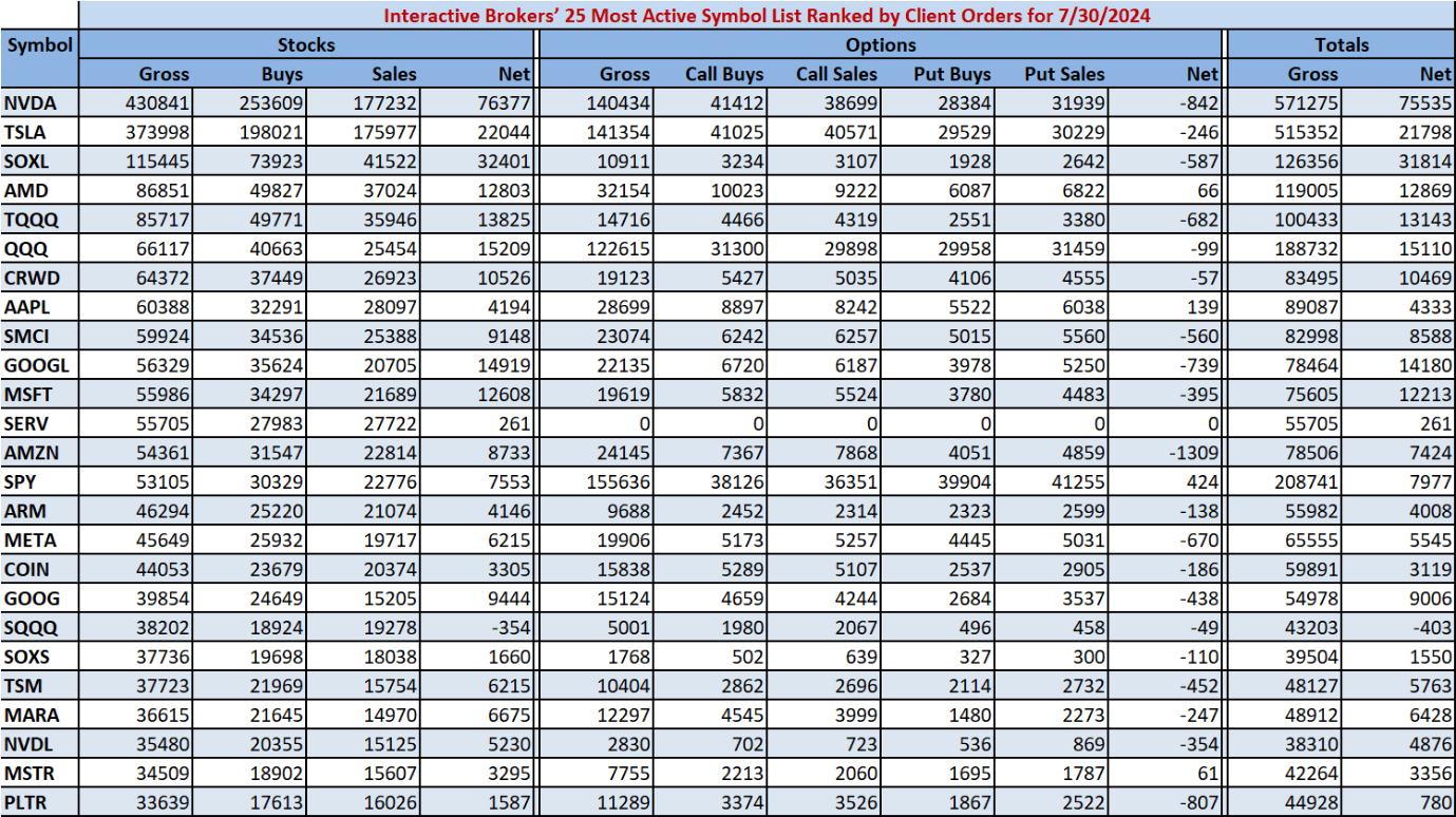 Interactive Brokers’ (IBKR) weekly list of the most-active symbols on its trading platform showed “remarkable” net stock buying activity in Nvidia (NVDA) and other tech names despite the ongoing selloff in the sector.