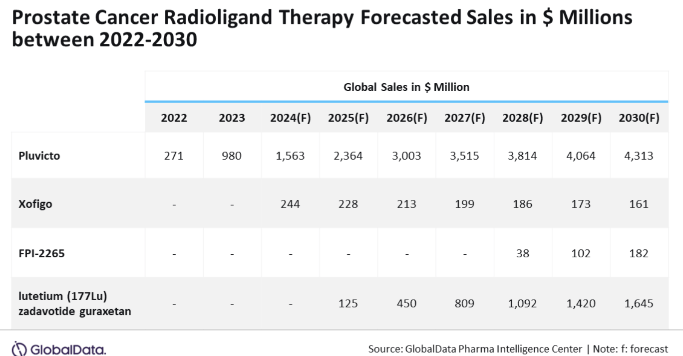 Other RLTs for prostate cancer are also projected to hit the market in the coming years. Among them is Eli Lilly’s (NYSE:LLY) lutetium (177Lu) zadavotide guraxetan (177Lu-PNT2002). However, with approval not expected until 2025, GlobalData projects only $125M in revenue that year rising to ~$1.65B in 2030.