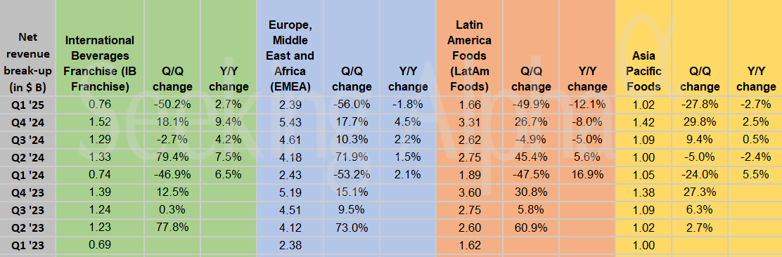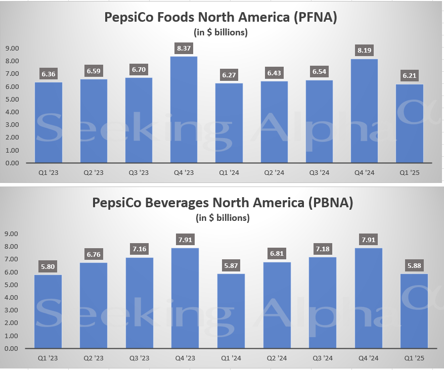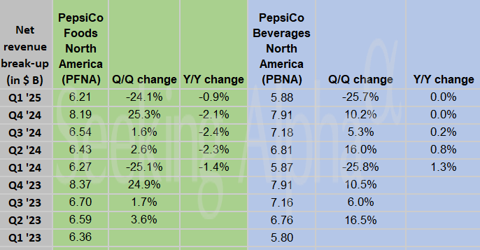 PepsiCo in charts: Seasonal Q/Q decline seen across all realigned business segments in Q1 Posted on April 24, 2025 by wpadmin More on Pepsico 3 Dividend Kings To Buy On Sale Now PepsiCo: Decreasing Sales Volumes Are A Short-Term Trend PepsiCo: A Refreshing Future PepsiCo falls after cutting guidance amid global trade uncertainty; Coca-Cola also dips Pepsico Non-GAAP EPS of $1.48 misses by $0.01, revenue of $17.92B beats by $190M
