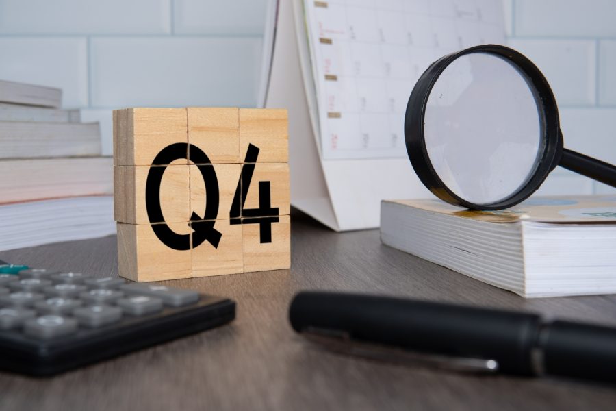 Close up image of wooden cubes with alphabet Q4 on office desk.