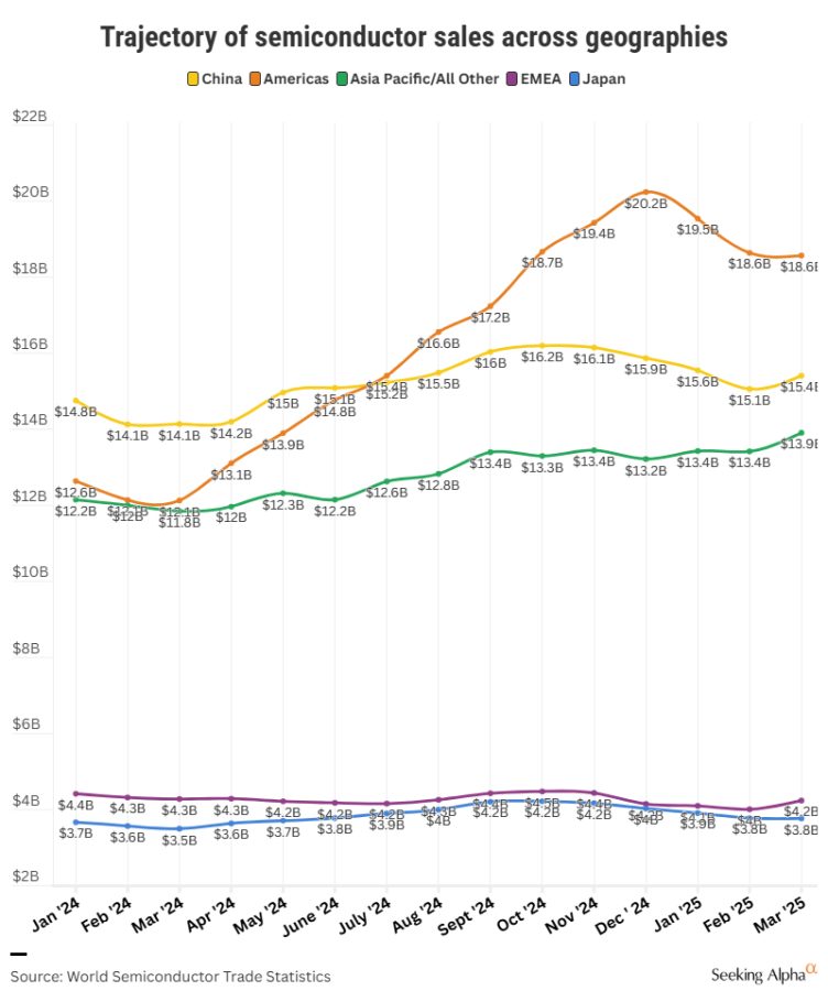 Compared to last year, the Americas recorded a 45.3% jump in semiconductor sales, while Asia Pacific was the runner-up at a 15.4% growth pace. China saw a 7.6% year-on-year rise in sales in February.