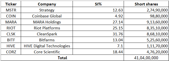 Among those that saw a decline were Strategy (NASDAQ:MSTR) where short interest declined to 12.63% from 13.41% in the previous month. MARA Holdings (NASDAQ:MARA), Riot Platforms (NASDAQ:RIOT), CleanSpark (NASDAQ:CLSK) and Bitfarms (NASDAQ:BITF) also saw short interest fall to 27.14%, 25.15%, 31.76% and 13.04% respectively.