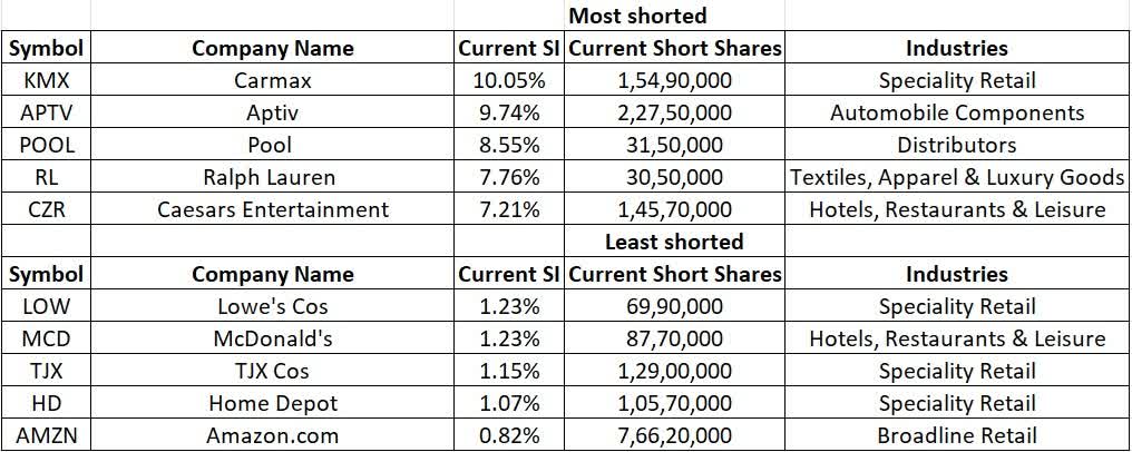 Carmax (KMX) was the most shorted stock at 10.05% of shares float, followed by Aptiv (APTV) with short interest of 9.74% and Pool (POOL) with 8.55%, respectively.