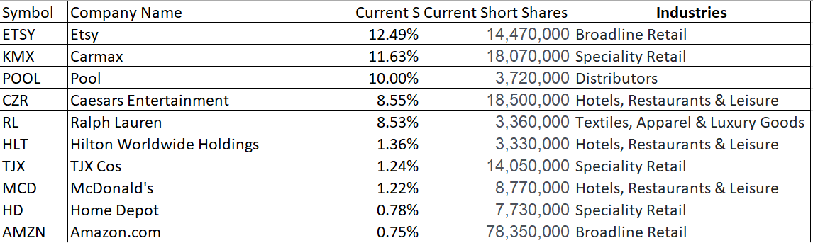 Etsy (ETSY) was the most shorted stock at 12.49%, followed by Karmax (KMX) with a short interest of 11.63% and Pool (POOL) 10.00%. Etsy (ETSY) and Carmax (KMX) short interest was down by 47 bps and 97 bps, while Pool (POOL) short interest went up by 35 bps over a month.
