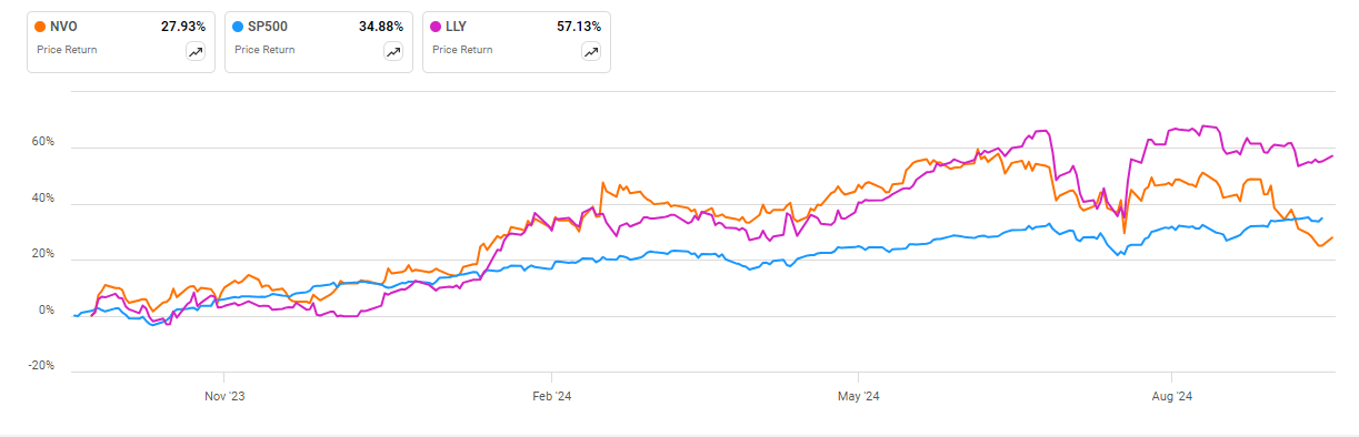 In general, LLY is up about 57% over the past 12 months. NVO remains higher by about 27% over that time, although that trails the 35% advance the S&P 500 has seen.