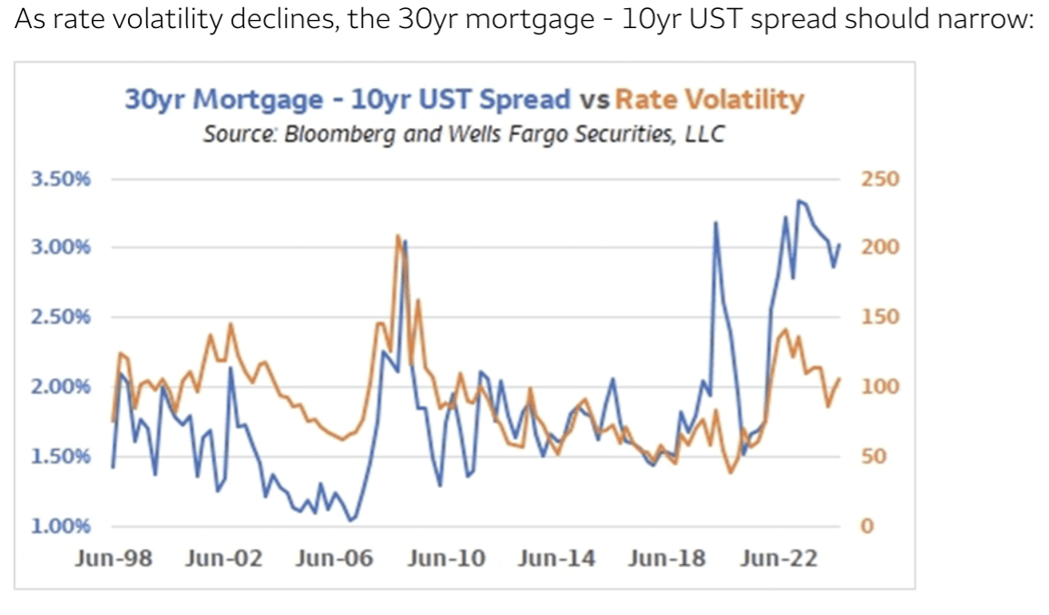 Harvey said rate volatility has significant influence over 30-year mortgage spreads (3-yr mortgage rate less 10-yr Treasury), and a lower rate of vol typically leads to tighter spreads, and vice-versa. Harvey included this chart: