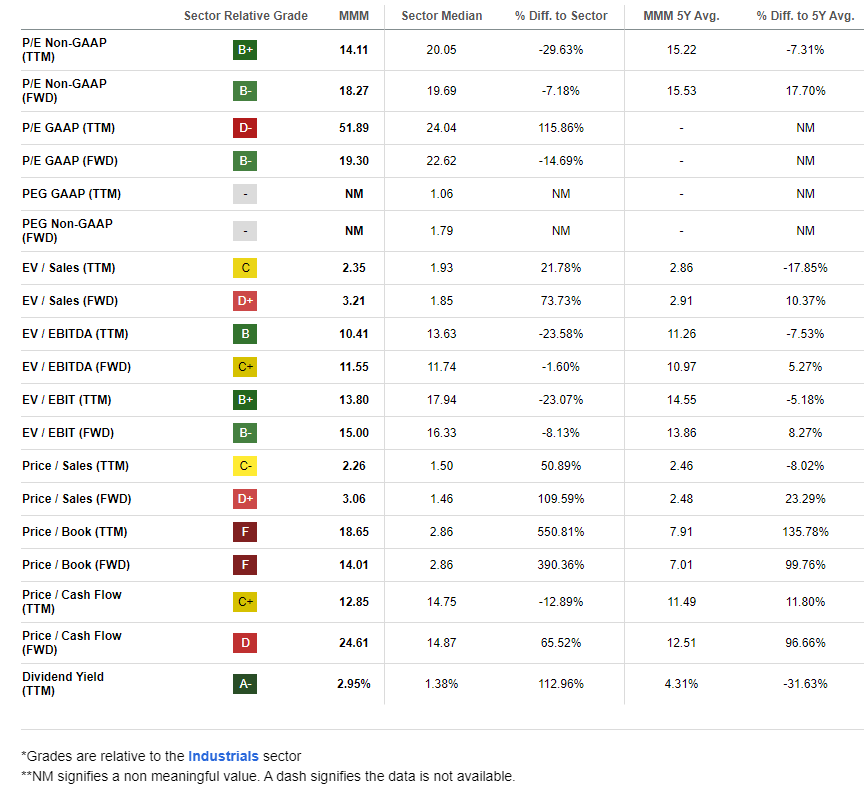 Compared to its peers, 3M sports a lukewarm valuation rating while its growth trajectory has been weak, but is forecast to improve and turn more consistent in the coming years.