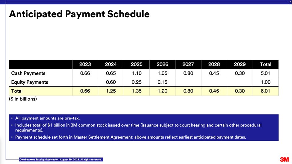 Over the next few years, 3M Company will have to pay $10.3 billion due to the PFAS settlement and $6.0 billion due to the Combat Arms settlement. For more information about the PFAS settlement, we can look at the 8-K Filing. And while $16.3 billion in payments certainly is a huge amount of money, the payments as part of the PFAS settlement are stretched over 13 years resulting in about $800 million in annual payments. And the Combat Arms payments are also stretched over several years with the following anticipated payment schedule.