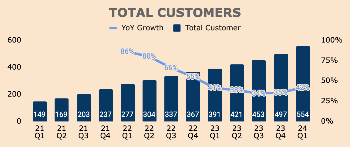 This is also reflected in the accelerating growth of Total Customers, which grew 42% YoY in Q1, to 554. Net New Customers added in Q1 was 57, the highest ever in a single quarter.