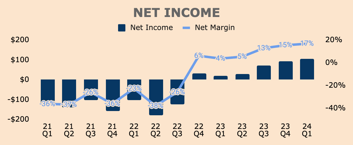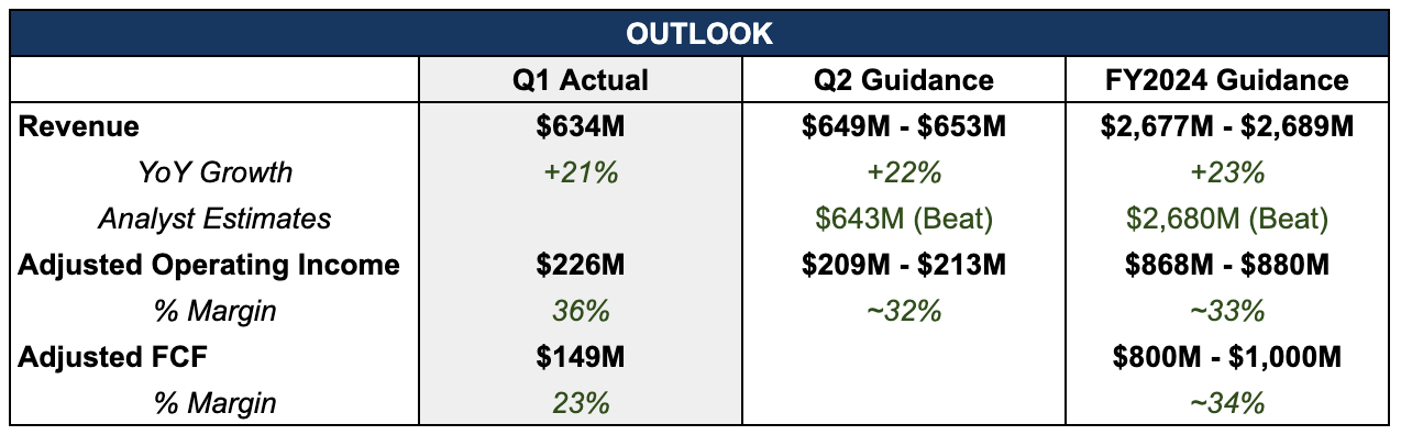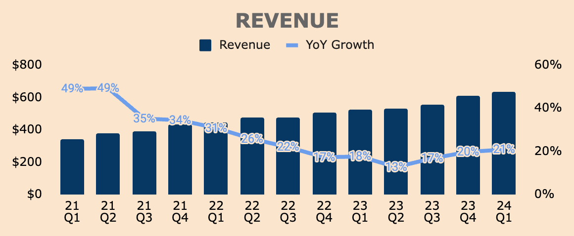 Such strong customer and deal growth led to a reacceleration of Revenue growth, to 21% in Q1, up from 13% three quarters ago. Revenue was $634M in Q1, beating management’s guidance by $20M and analyst expectations by nearly $17M.