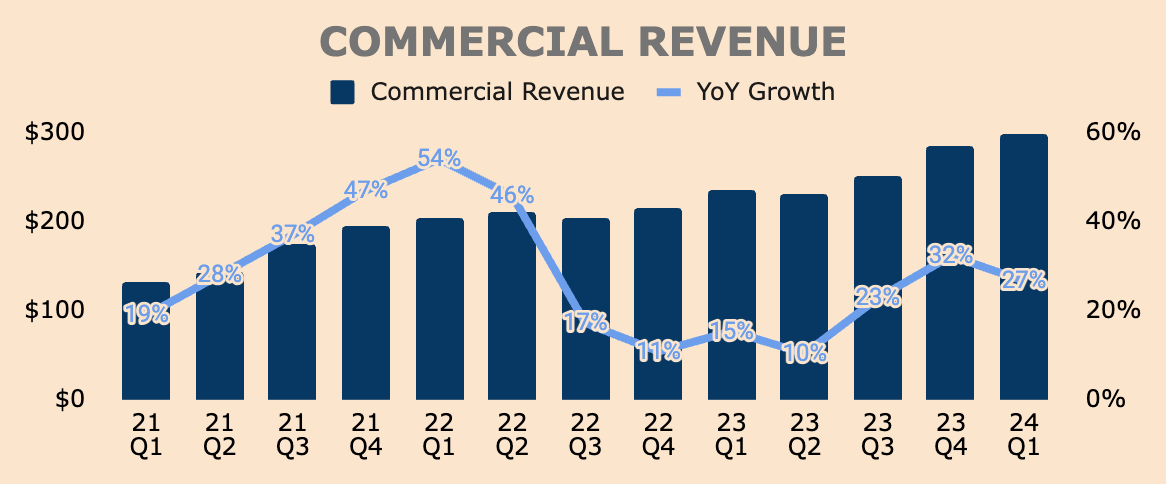 Q1 Commercial Revenue was $299M, up 27% YoY, mainly driven by AIP and the bootcamps.