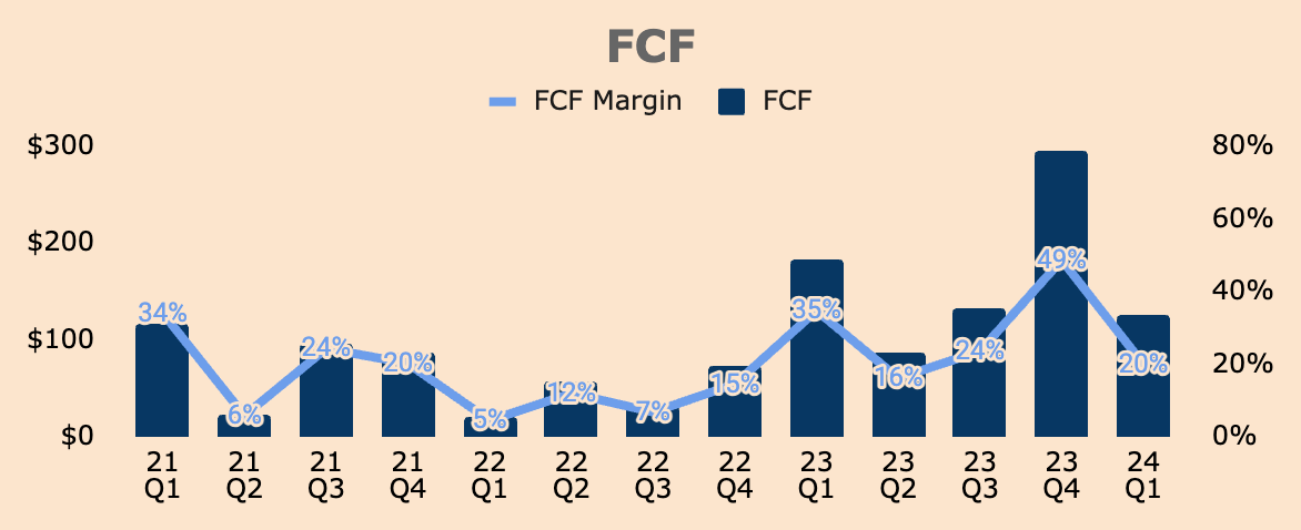 - In Q1, Free Cash Flow was $127M at a 20% FCF Margin.