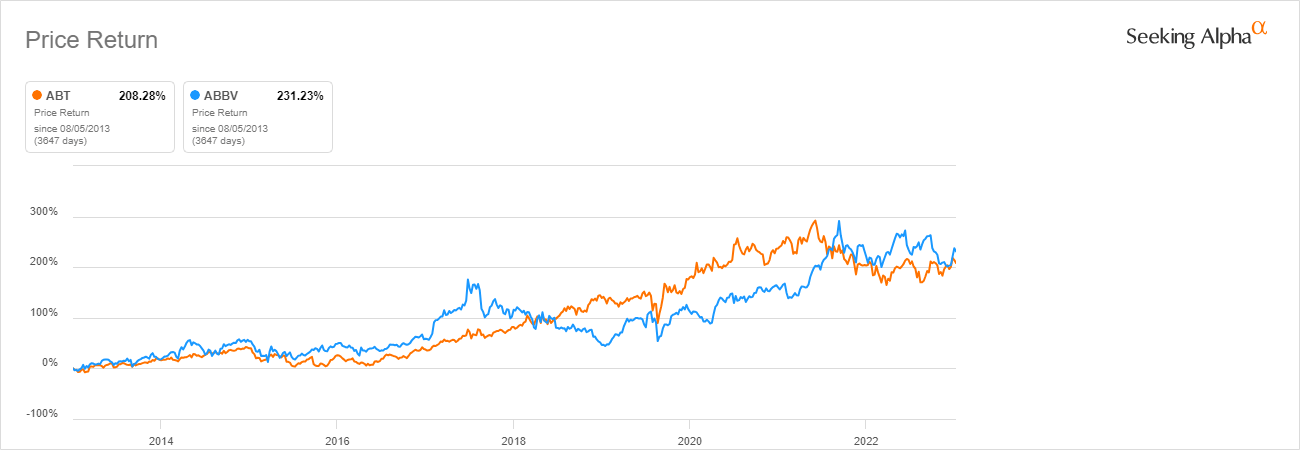 An interesting contrast between these two investment opportunities lies in the fact that AbbVie was spun off from Abbott in 2013 and since then both have been hugely successful with their share price up over 200%.
