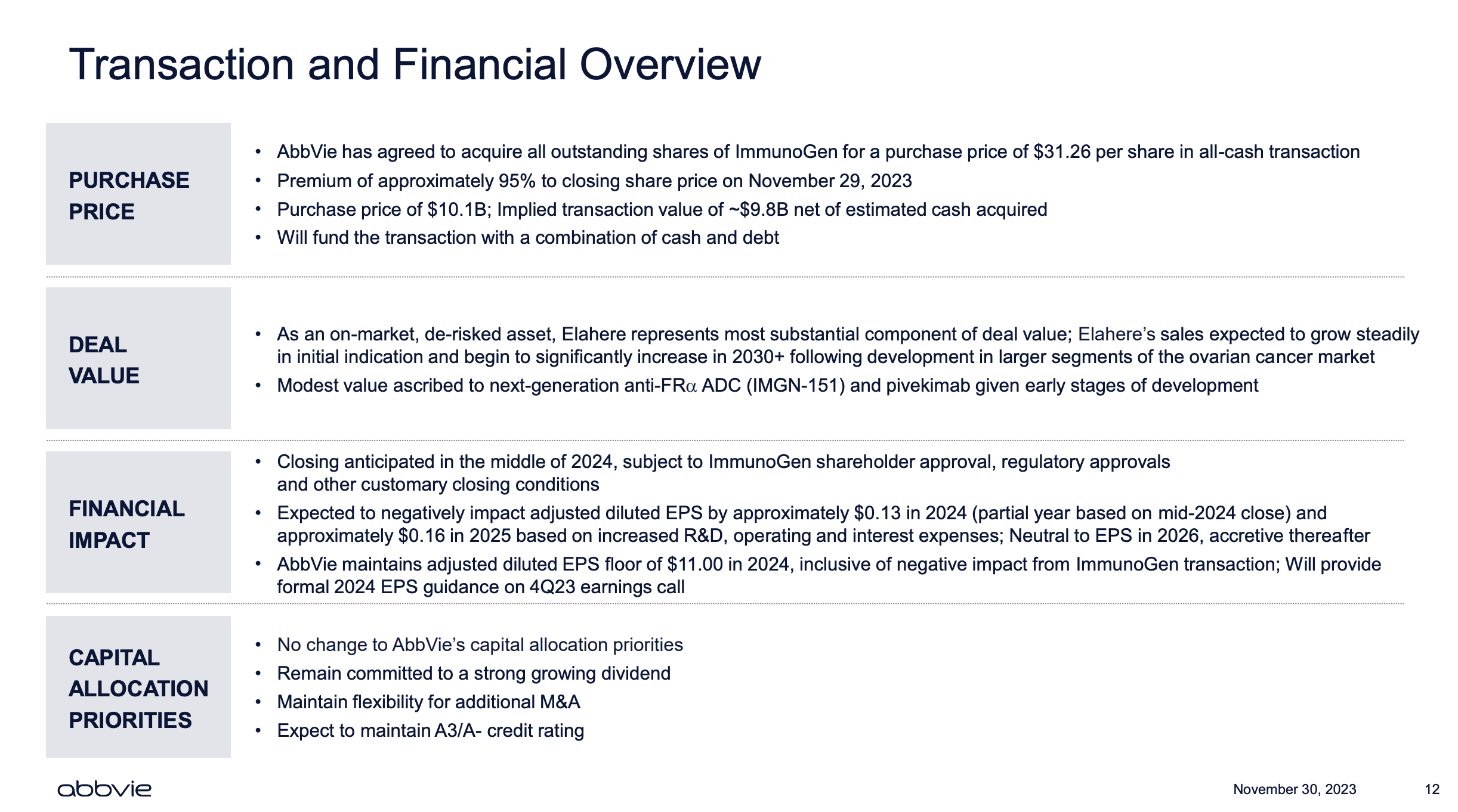 The small biotech has the ovarian cancer drug Elahere approved, with a consensus revenue target of $375 million this year and jumping to nearly $1 billion by 2026. The deal is dilutive by $0.13 in 2024 depending on the actual closing date of the transaction.