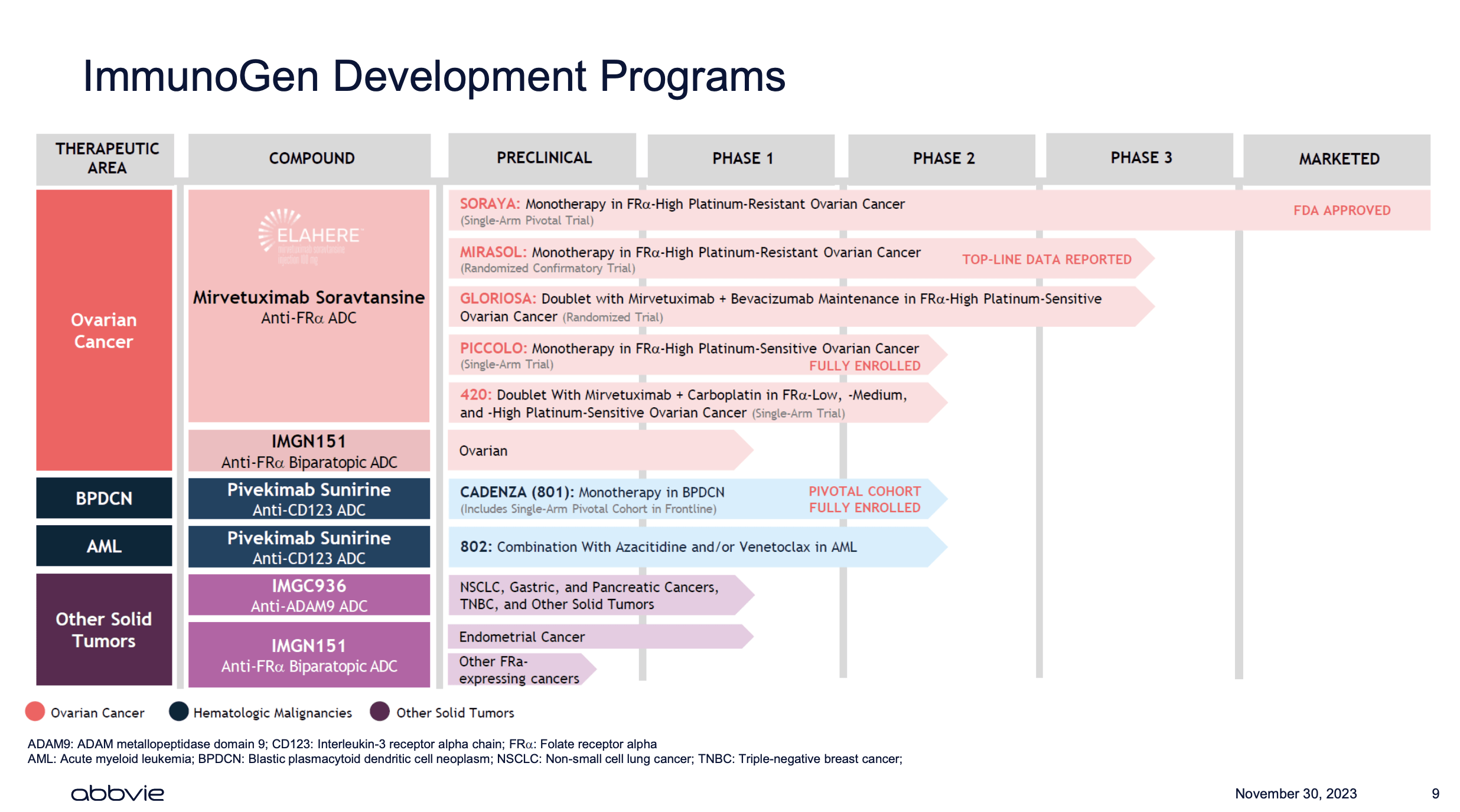 ImmunoGen has a solid development program, with drugs targeting solid tumors and hematologic malignancies. The hematologic malignancies drug has several Phase 2 studies ongoing.