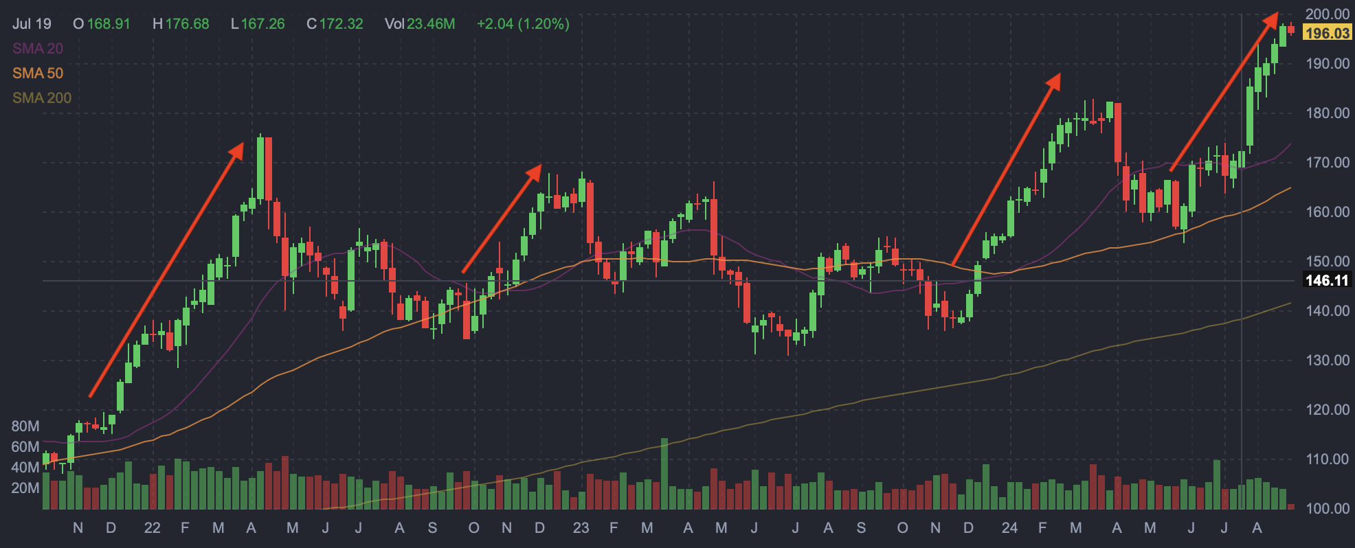 ABBV weekly candlestick chart (Finviz.com with red arrows by Zvi Bar)