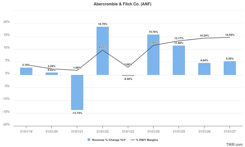 - ANF isn’t assessed to be significantly overvalued while still boasting sector-leading growth metrics.