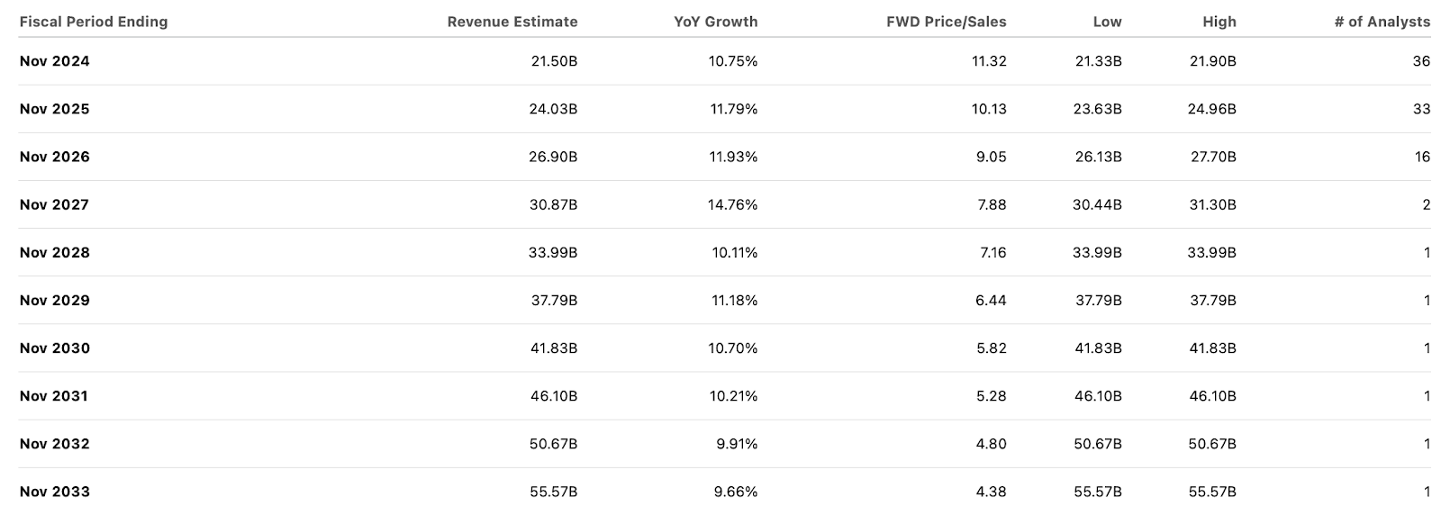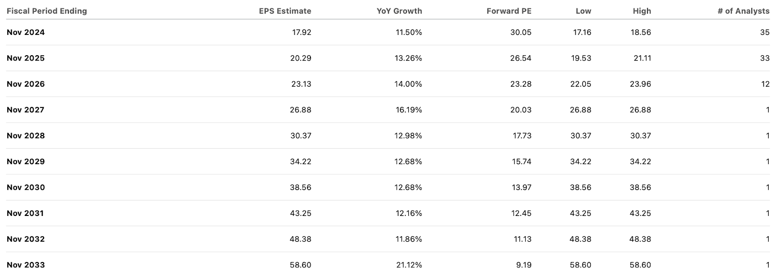 Given that companies typically experience decelerating growth due to the law of large numbers, these revenue consensus estimates look awfully aggressive. Earnings estimates are not much better, with analysts expecting a 48% net margin by 2033.