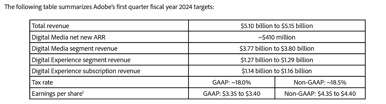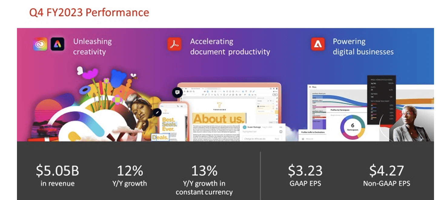 In its most recent quarter, ADBE generated 12% YoY revenue growth to $5.05 billion, surpassing guidance of between $4.975 billion and $5.025 billion. Non-GAAP EPS of $4.27 exceeded guidance of between $4.10 and $4.15.