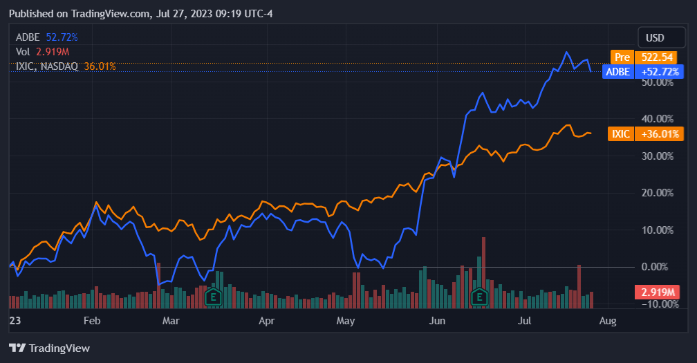 Adobe (NASDAQ:ADBE) shares have had an interesting trajectory throughout this year. While trading below the NASDAQ Composite’s price return throughout most of the first half, its shares saw significant appreciation in the run up to its latest earnings report. These gains have persisted, and another round of buying appears to have taken hold here in late July. The stock nonetheless continue to trade cheaper than its all-time high of $670.