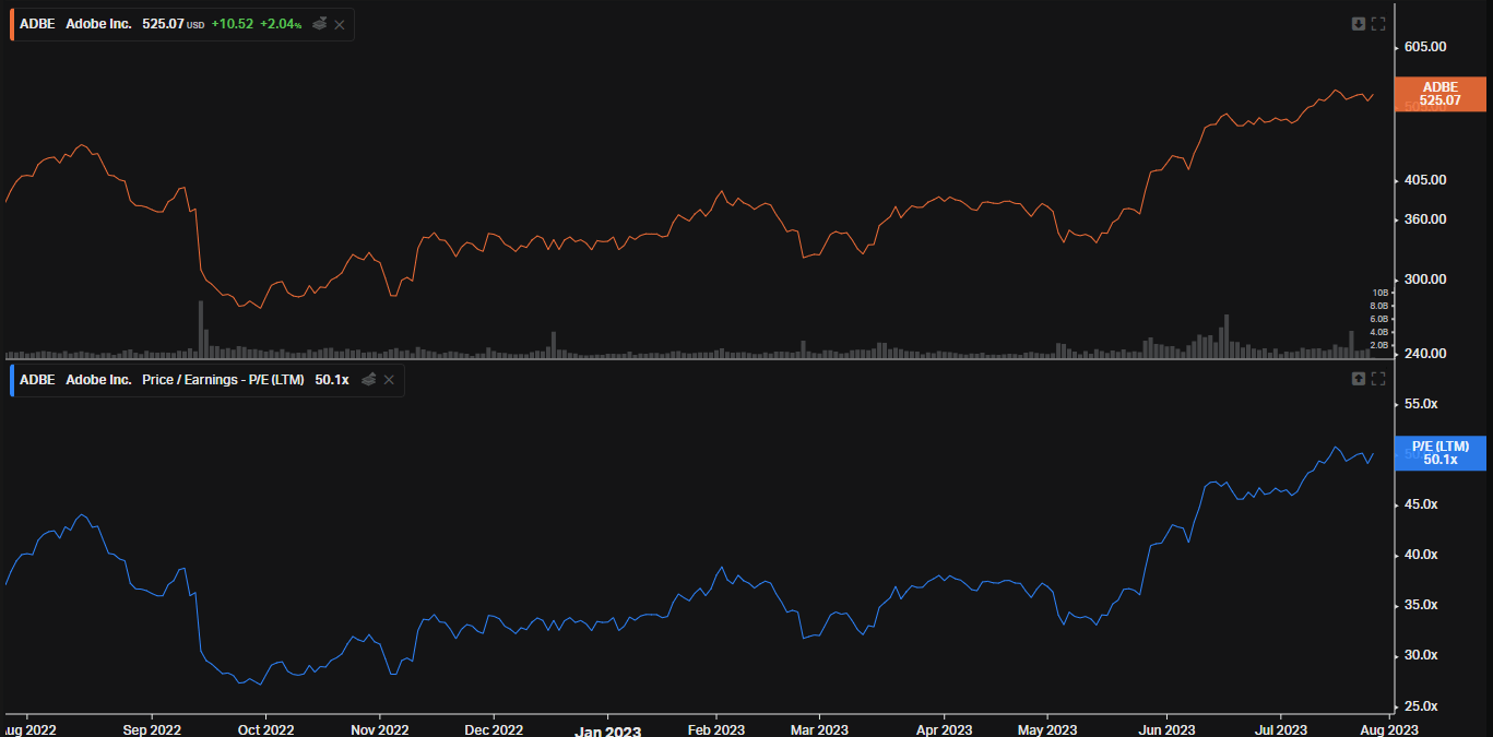 On a more granular timeframe, however, the story is different. Adobe stock is trading more expensively than it has been at any point over the last year. This makes sense given that the stock is appreciating in advance of fundamental improvements.