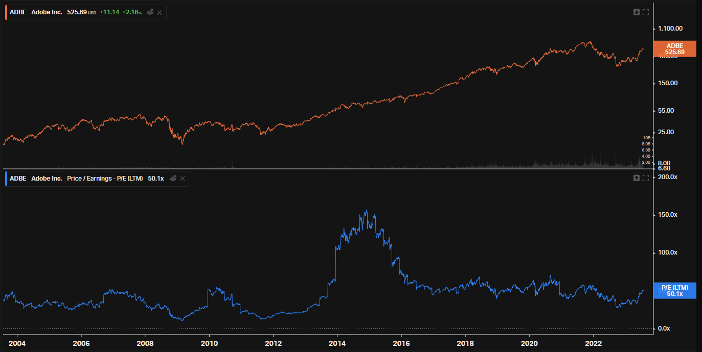 Looking at Adobe’s P/E ratio over its trading history, we can surmise that it is not actually particularly expensive at the moment. We can see that its current trailing P/E multiple of 50.2x is nowhere near all-time highs and indeed quite close to where it has traded over most of the last 7 years.
