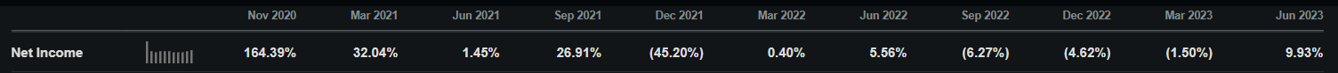 The profitability picture here is more murky. Far from being as consistent as the firm’s revenue growth, we can see that net income actually decreased y/y for 3 out of the last 4 quarters. This could indicate difficulties in terms of maintaining margins.